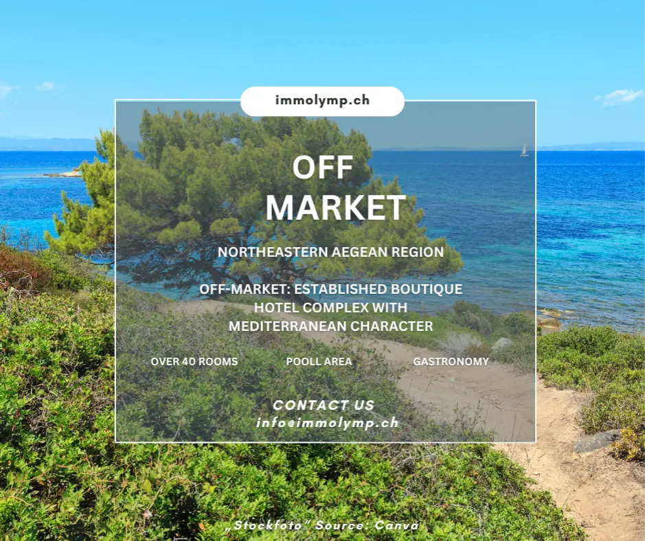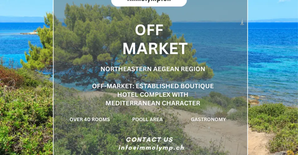 The property is located in the northeastern Aegean region, an established holiday region with an international clientele and growing demand for high-quality boutique accommodation. The sale will take place via an existing Greek public limited company (A.E.), which will enable an uncomplicated and tax-efficient transfer.